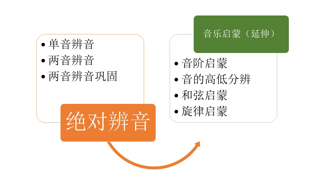 绝对辨音教学可以培养宝宝的绝对辨音能力(即:绝对音感),让宝宝远离五音不全,为今后轻松的学习和享受音乐奠定基础。绝对辨音教学为宝宝培养一双好耳朵,提升听觉灵敏度,提升听觉智能水平,对宝宝学习语言(尤其外语)会有非常大的帮助。此外,听觉发达的宝宝专注力和记忆力更好,情绪饱满,心态乐观积极,更善于表达和沟通,情商更高,进而在学习、工作、生活中的综合表现更加自信突出,成为优势群体。